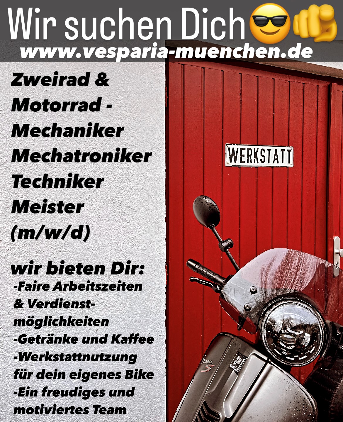 Wir sind Deine unabhängige Fachwerkstatt für Vespa, Piaggio, Aprilia und Moto Guzzi in München. Mit technischer Präzision und echter Hingabe bieten wir erstklassigen Service: von Wartung und Reparaturen über Restaurationen bis hin zu Motorinstandsetzungen und TÜV-Hauptuntersuchungen – alles streng nach Herstellervorgaben, ausgenommen herstellerbezogene Garantieleistungen und Rückrufaktionen. Neufahrzeuge gibt es auf Anfrage und mit Terminvereinbarung, unser Showroom lädt zum Entdecken ein.